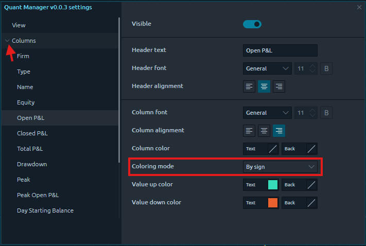 Click the dropdown menu to see all of the individual column settings. You can change the header settings, column alignment, and colors. For columns that are numbers, you can also change the coloring mode to reflect the value of the number.