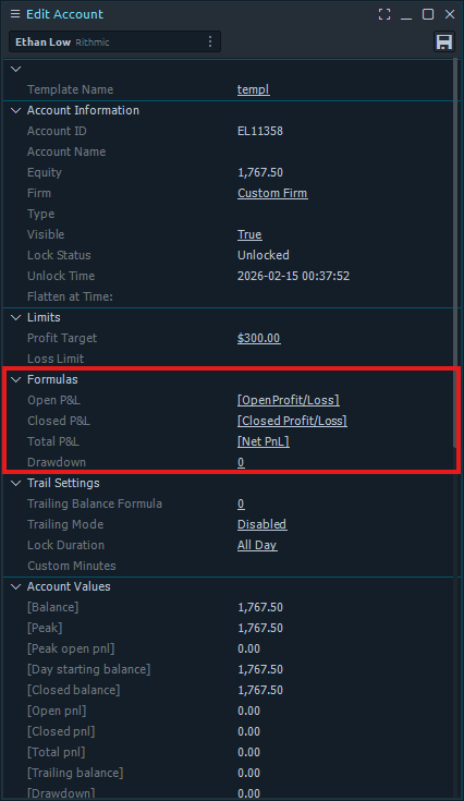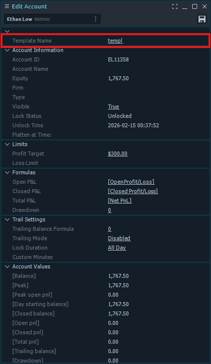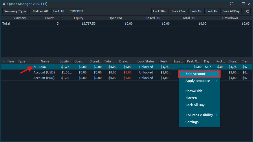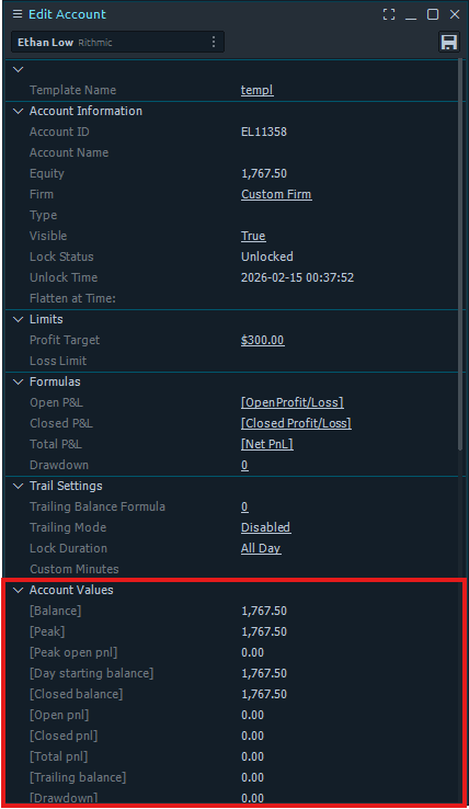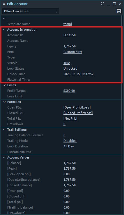 The second section displays the account information including Account ID, Equity, Firm, Type, Visible, Lock Status, Unlock Time, and Flatten at Time.