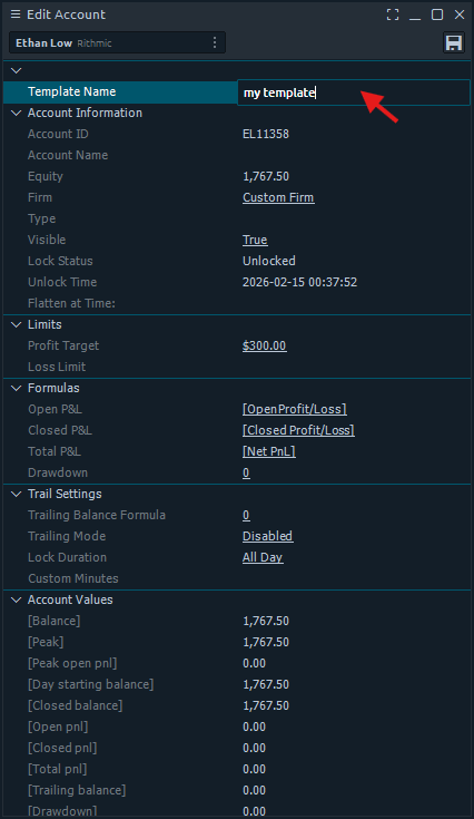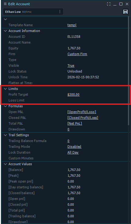 The third section contains the Limits with Daily Profit Target and Daily Stop Loss. Set these to define your risk boundaries for the account.
