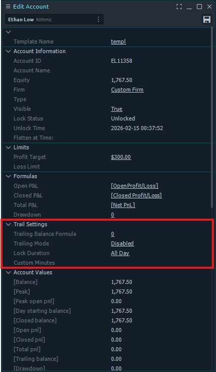 The fifth section configures the Trail Formula and Trail Lock settings, including Trailing Balance Formula, Trailing Mode, Lock Duration, and Custom Minutes.