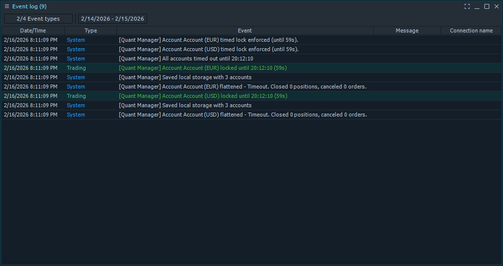 Look for events with the [Quant Manager] tag to see why an account was locked.